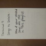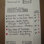- Playlist based on all checked-in users playlists (pulling from…. phone mp3s? last.fm or grooveshark accounts/playlists?) – system figures out which songs the most people have and plays those; but just because you all secretly like Mylie (or have a song you like to study to) doesn’t mean you want to hear it when you’re out. And this relies on users keeping their list updated.